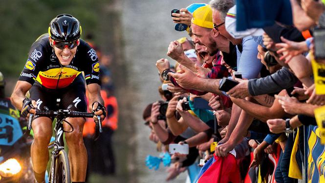 ‘Gilbert!’ a voice cries behind me. I turn. A man-machine darts from the woods on the Oude-Kwaremont like a missle. In profile Phillippe Gilbert’s Belgian jersy shines bright as a ray of seemingly divine sunlight pierces the clouds and lights him like a floodlight as he plumpets down the shaded country lane. There was no hesitstion, no pause in his peddaling as he distances the motorcycle that is shadowing him.
