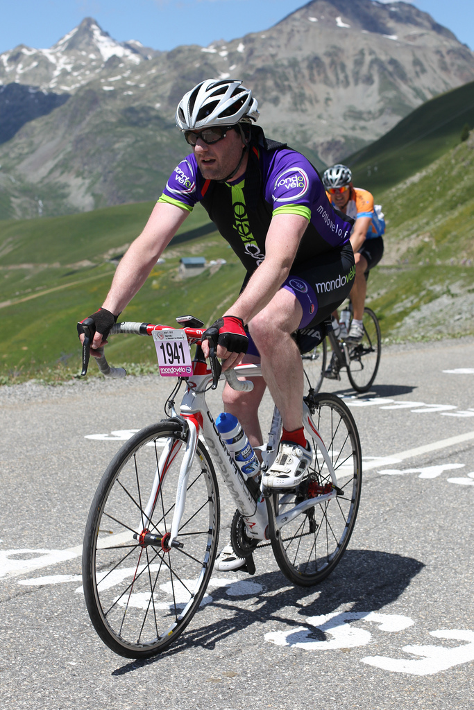 One hour gone, brief comfort break, first food of the day and 28km covered. Next up, the Aubisque. 16.4km long with an average gradient of 7.1%. Gentle climb through the woods then a steep kick through the town of Faux-Bonnes . I was feeling fine and was having no trouble keeping my heat rate below 150bpm. We climbed through the clouds and by the time I reached the top I was cold. Comfort break and water and then descent. The road was wet and greasy and I descend slowly with both front and back breaks deployed. Bikes descend in a line with cloud meaning you could only make out one bike ahead. Occasionally a Ghost bike would emerge from behind and whiz by, disappearing into the mist . Road tunnel. One eye closed before entering and immediately adjusted to the dark. After a cold and miserable few minutes I was pleased to start the 2Km climb of the Solour. I had been here before in etape 2010. The descent to Argeles-Gazost was painful and slow until we emerged from the clouds and the road dried. Great buzz in the town and I rode by the food stop. Jinked my way through the steep, narrow streets and pulled off the route at our hotel. Spectators watched in amazement as I dipped my hand in a bush and pulled out a mussette full of goodies.